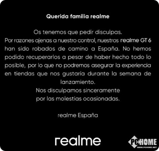 真我西班牙官方账号在海外社交媒体发文称,首批真我GT6在运往西班牙的途中不幸遭遇盗窃,尽管公司采取了所有可能的措施,但产品仍未能追回。因此,原定的发布活动无法提供预期的体验。