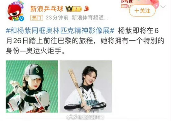 据北京时间报道,新浪乒乓球官博官宣杨紫将于26日出发巴黎担任奥运火炬手。