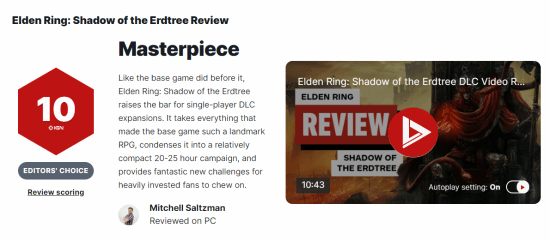 《艾尔登法环》DLC“黄金树幽影”媒体口碑已解禁,IGN给出10分的成绩。