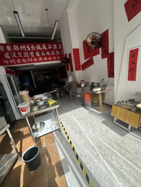 那天像在办一场葬礼,被送走的是这100多平米店面。没有人来,几张桌子和一瓶矿泉水孤零零立着。红底黑字的条幅上,还有醒目的初衷——“带天水麻辣烫来郑州混”,老板王闪闪坐在底下,煞有介事地宣布,“我们倒闭了。”