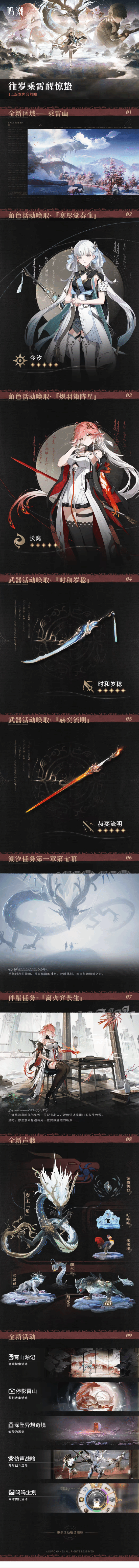 今日,《鸣潮》官方放出了1.1版本“往岁乘霄醒惊蛰”的一图流版本前瞻,官方在图里介绍了游戏的全新地图、角色与声骸等,以及一些全新的活动,我们一起来看一下。