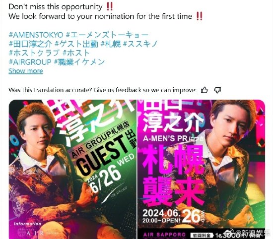 近日,某风俗场所账号官宣杰尼斯KAT-TUN前成员田口淳之介将营业,公告上写着:“第一次,等待您的指名!”