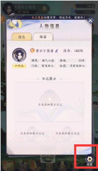 2、在人物信息页面的右下角,我们可以看到【设置】按钮。