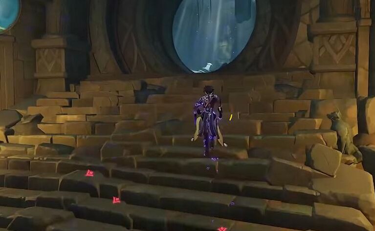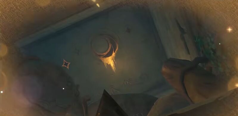 5、进入之后玩家直接前往下图的光标,可以看到正前方左右都有壁画,玩家只需要各拍一张即可。