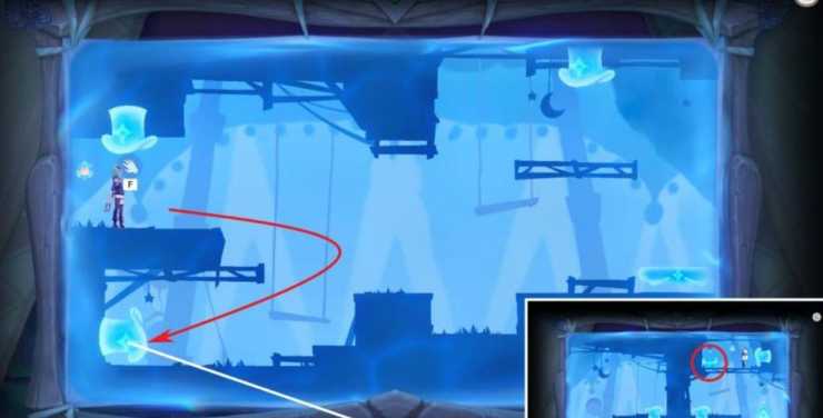 4、顺着楼梯上去,先旋转面前的彩灯,再旋转对面的彩灯升起舞台,拾取旁边的彩镜会出现一个映灯;