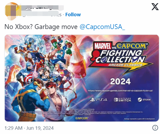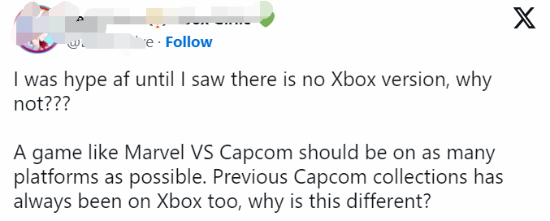 虽然卡普空尚未解释原因,但粉丝们已经开始在社交媒体上表达不满。据IGN报道,“No Xbox”一词甚至登上了社交媒体的热搜。一些疑惑的玩家写到,“我一直很兴奋,直到我看到没有Xbox版本,为什么会这样呢?”“像《漫威vs卡普空》这样的游戏应该在尽可能多的平台上推出。该系列以前的作品也一直在Xbox上推出,为什么这个不同?”