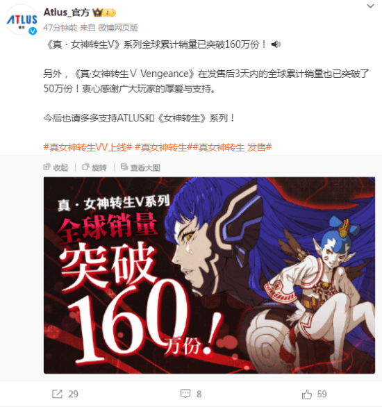 ATLUS官方宣布,《真女神转生5》系列全球累计销量已突破160万份。同时,《真女神转生5:复仇》在发售后3天内的全球累计销量也已突破了50万份!衷心感谢广大玩家的厚爱与支持。