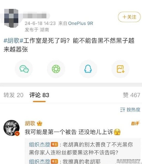 有粉丝要求胡歌工作室对黑粉提出诉讼,称黑粉越来越嚣张。随后,胡歌回应粉丝的告黑诉求,“我可能是第一个被告,还没地方上诉”。
