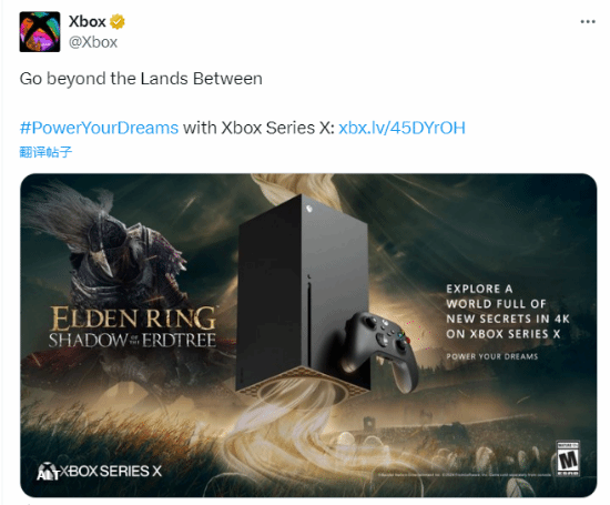 距离《艾尔登法环:黄金树幽影》发售仅剩一天时间。今日(6月20日),微软Xbox官方推特发文宣传:“来用Xbox Series X探索交界地吧!”