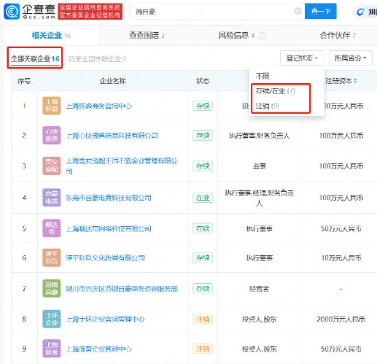 企查查APP显示,Uzi(本名简自豪)名下关联16家企业,其中7家为存续或开业状态,包括东莞市自豪电竞科技有限公司、上海怀淼商务咨询中心、上海男女搭配干活不累企业管理有限公司等。