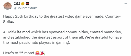 “祝史上最伟大的电子游戏《反恐精英》25岁生日快乐。这款由《半条命》Mod催生的游戏变成了一个巨大的社区,创造了无数经典的回忆,并建立了最伟大的电子竞技。我们很感激在这里拥有最热情的游戏玩家。再来干个25年吧!”