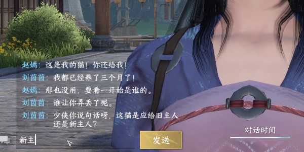 1、首先我们需要来到汴京(977,1128)这个位置找到NPC刘茵茵,进行对话,对话结束之后我们就可以接取任务了,接取任务之后我们需要在旁边听取猫咪到底归谁;