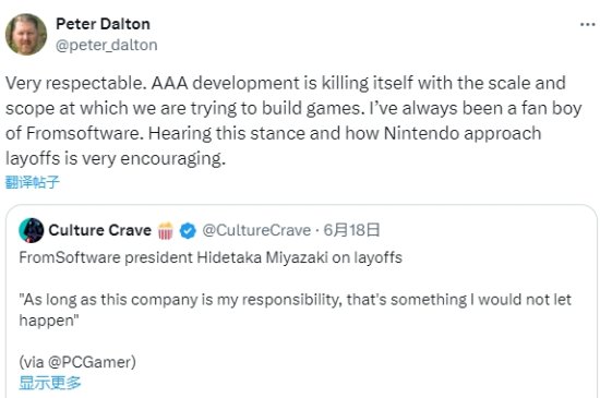 Bluepoint Games的技术主管Peter Dalton也对此发表了自己的看法。他在同意宫崎英高的观点的同时指出,行业目前的野心正成为其最大的败笔。“3A级游戏开发的范围和规模让我们在制作游戏的过程中自寻死路。”Dalton如此表示。