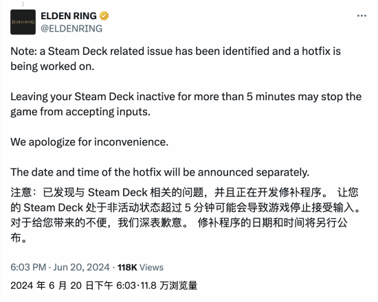 对此,官方也第一时间发文,表示已意识到Steam Deck相关问题,并且正在开发修补程序,深表歉意,修补程序的日期和时间将另行公布。