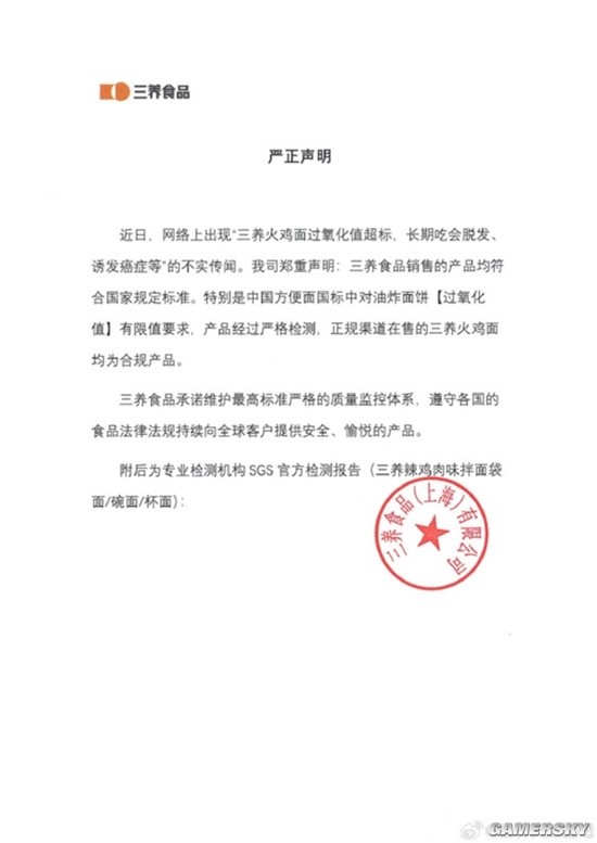 声明称,近日,网络上出现“三养火鸡面过氧化值超标,长期吃会脱发诱发癌症等”的不实传闻。我司郑重声明:三养食品销售的产品均符合国家规定标准。