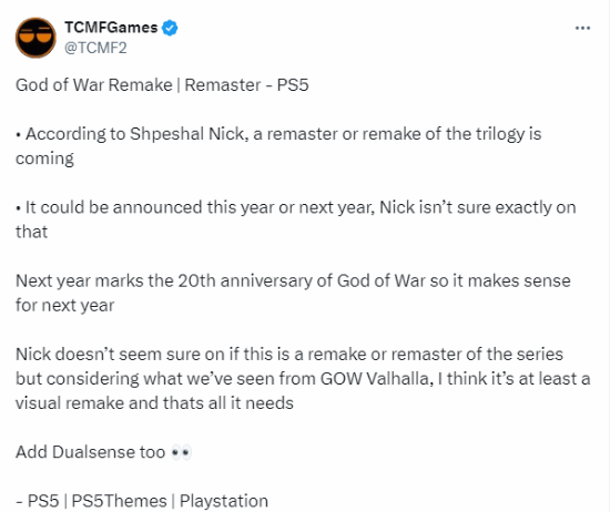 此外,Shpeshal Nick也不确定新的《战神》游戏是Remake重制版还是Remaster复刻版,但视觉效果应该会更现代化,也会适配PS5手柄及其最新功能。