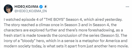昨日(6月20日),《黑袍纠察队》第四季第四集“Wisdom of the Ages”正式上线。游戏制作人小岛秀夫对本集发表了观后感:
