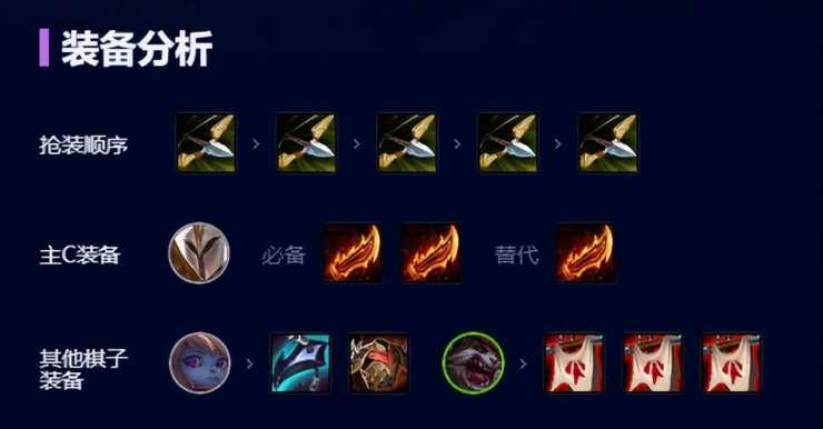 2-1阶段因为我们选择崔斯特-好运来符文必出潘多拉的装备,选择潘多拉的装备后,装备顺序。首先给天使做出三把羊刀,其次给克烈做三旗子(基克的先驱),最后给波比做龙牙(巨龙之爪)、反甲(荆棘背心),因为德玛西亚的效果,波比自带一件光明装备,剩余装备都通过潘多拉的装备变成窃贼手套给4费5费卡即可。