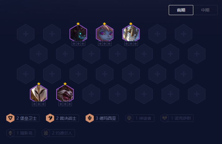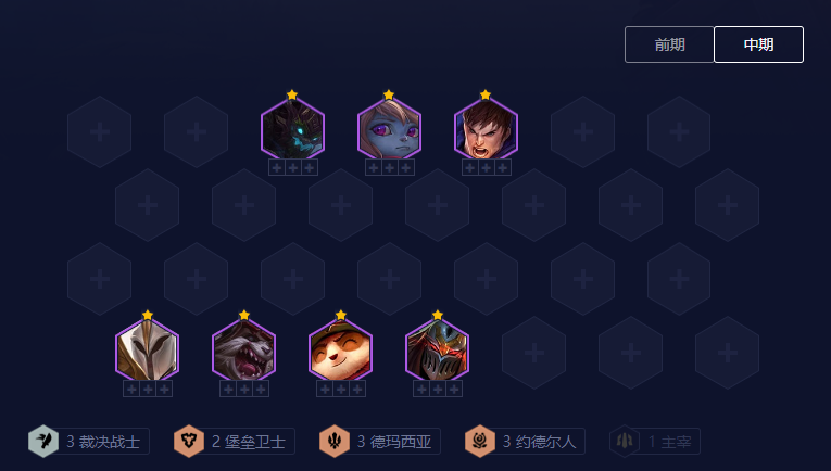 羁绊组成:5裁决战士3德玛西亚3约德尔2堡垒战士2暗影岛