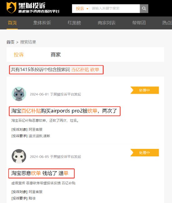 消费者多次联系客服无果。在黑猫投诉平台搜索关键字“百亿补贴 砍单”,可查询到1400余条投诉。