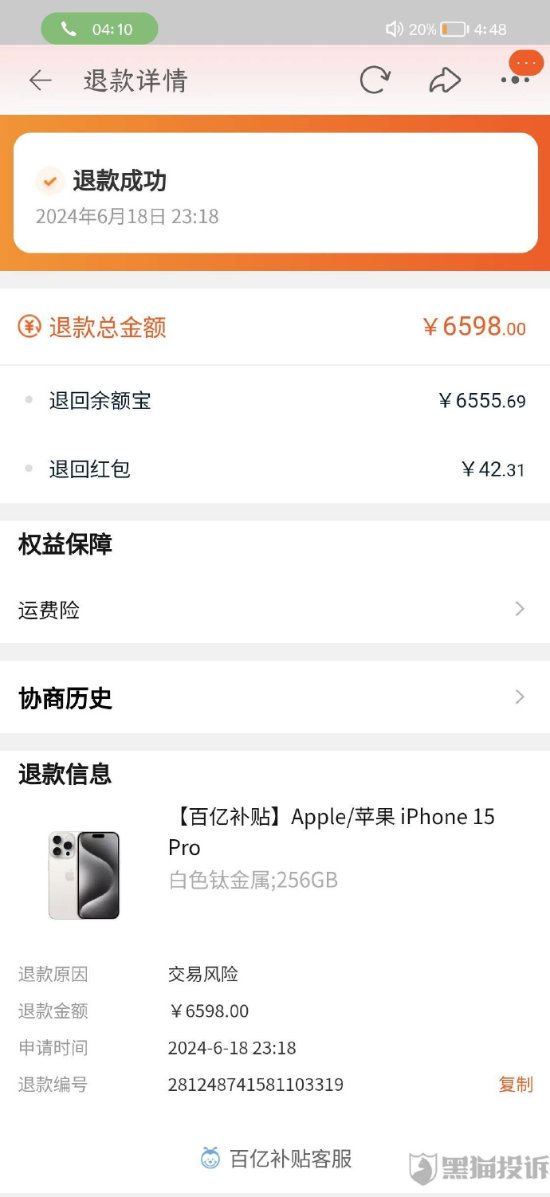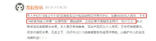 据黑猫投诉消息,近日,有消费者在黑猫投诉平台反馈,在百亿补贴活动中三次购买iPhone 15 Pro,每次都被以“交易风险”为由退单,均未成功交易。
