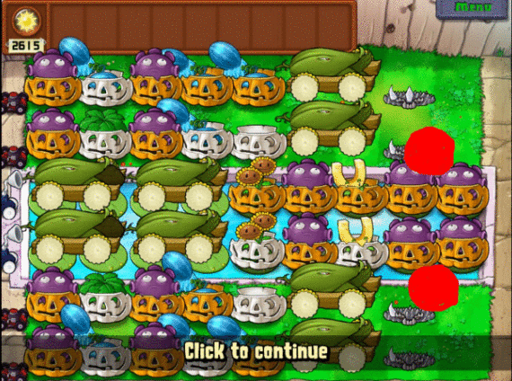 水池里种了四把炮,陆地上种了两边的炮,方便以后搭梯子。一边种冰瓜,一边套南瓜,种冰瓜后阵容大致形成。