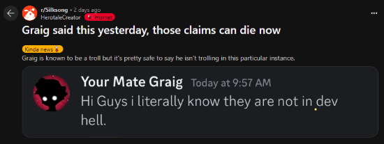 开发商Team Cherry对此一直保持沉默,不过本作的首席游戏测试员Graig最近在游戏的官方Discord频道上提供了最简单的保证,称该游戏并未陷入开发困境。