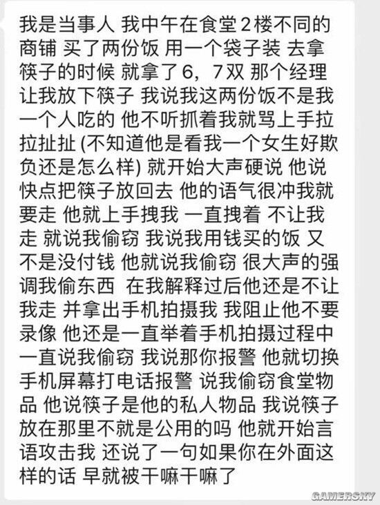 当事女生称:“在食堂商铺买2份饭拿了六七双筷子,食堂工作人员说我偷窃食堂物品,她向对方解释称,这两份饭并不是她一个人吃。