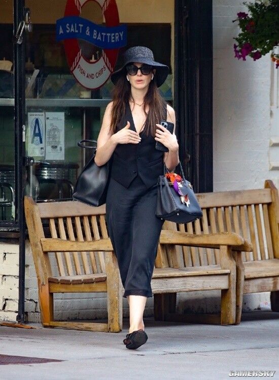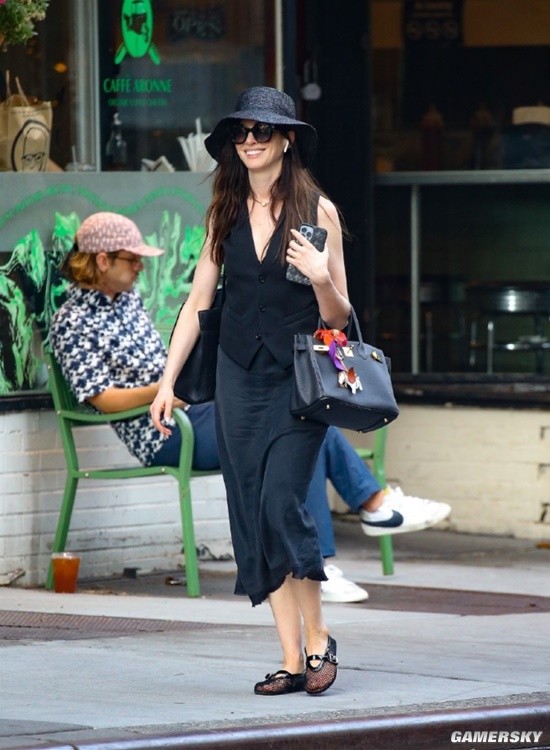 当地时间6月18日,美国纽约,安妮·海瑟薇现身街头。身穿黑色西装马甲配黑色丝绸半身裙,搭配同色系遮阳帽,脚踩时下流行的渔网芭蕾舞鞋,整套造型日常而时尚。