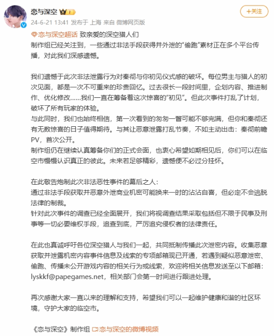 6月21日,部分疑似叠纸旗下乙游《恋与深空》新角色秦彻的素材在网络各个平台上传播,《恋与深空》官方对此进行了回应。