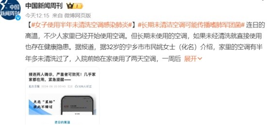 女子使用半年未清洗空调感染肺炎 确诊为军团菌肺炎