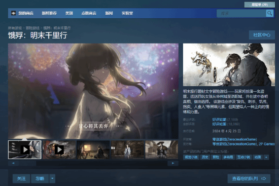 零创游戏官宣其开发的文字冒险游戏《饿殍:明末千里行》销量突破了40万份,游戏自4月23日发售至今取得了97%的好评率(好评如潮)。