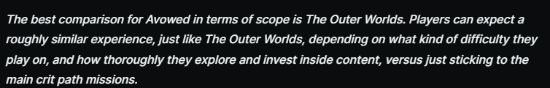 Obsidian新作《宣誓》的游戏总监Carrie Patel在接受采访时表示,游戏不会像《上古卷轴:天际》那样庞大,其长度和工作室此前的《天外世界》类似。