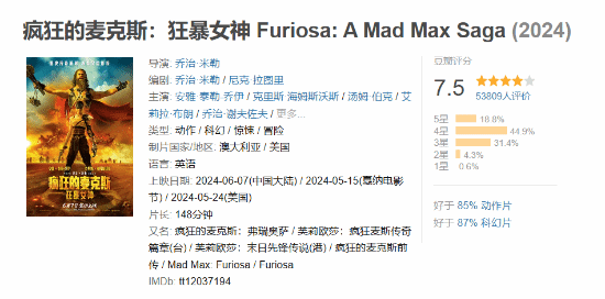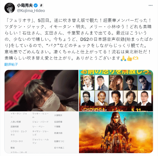 知名制作人小岛秀夫近日在推特表示,自己已经连续五次观看了电影《疯狂的麦克斯:狂暴女神》,且第五次看的是日语配音版本,并在推文中称赞了一些配音演员的表现。截止发稿前,《疯狂的麦克斯:狂暴女神》在豆瓣的评分为7.5分,烂番茄新鲜度为90%。