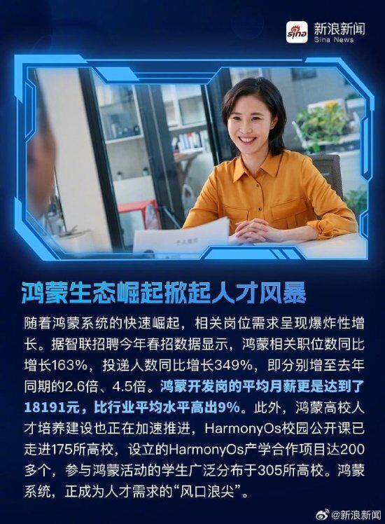 据今年春招数据显示,鸿蒙相关职位数同比增长163%,投递人数同比增长349%。鸿蒙工程师的平均月薪更是达到了1.8万,高出行业平均水平9%,成为技术人才的高薪新选择。