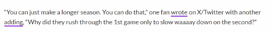 据dexerto报道,不少粉丝对《最后生还者》第二季没有完整的故事而感到失望。有粉丝表示:“为什么首季结束得匆匆忙忙,第二季就要放慢节奏?”“为什么不把第二季做得长一点?”