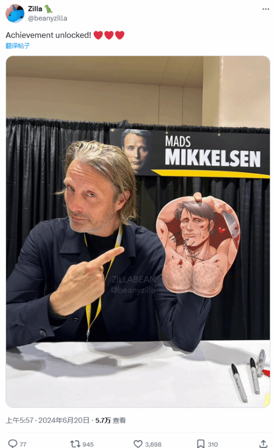 在近期的美国芝加哥动漫及娱乐展览会上,一位“拔叔”麦斯·米科尔森的狂热粉丝想送给拔叔一张以拔叔胸肌为主题设计的鼠标垫作为礼物。尽管最终拔叔没有收下这份礼物,但还是在这张鼠标垫上签名并与其一起拍摄了合影送给了这位粉丝。