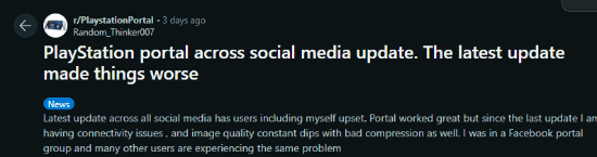 有玩家指出,更新后PlayStation Portal经常无法正常连接网络或主机,且图像质量也有所下降。许多网友表示遇到了类似的问题,最严重的还有人出现了死机的情况。