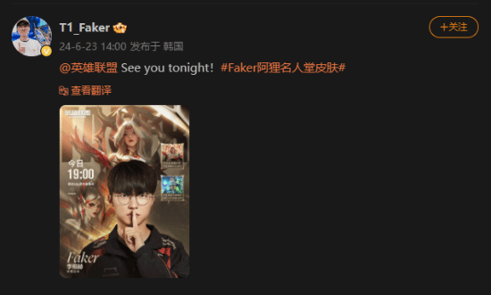 今日(6月23日),《英雄联盟》首位名人堂选手Faker即将于19:00出现在抖音英雄联盟官方直播间。其官方微博发文进行了预热。