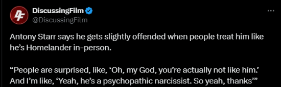 《黑袍纠察队》第四季第四集中祖国人主演安东尼·斯塔尔贡献了相当精彩的演技,并获得了广大观众的称赞,不少人表示他出现的镜头压迫感十足,像看恐怖片一样。