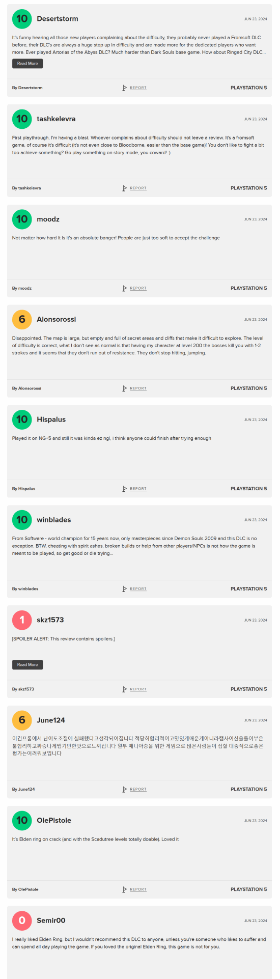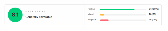 据Metacritic数据显示,截至目前,“黄金树幽影”的用户评分为8.1分,其中好评率74%,中评率8%,差评率18%。