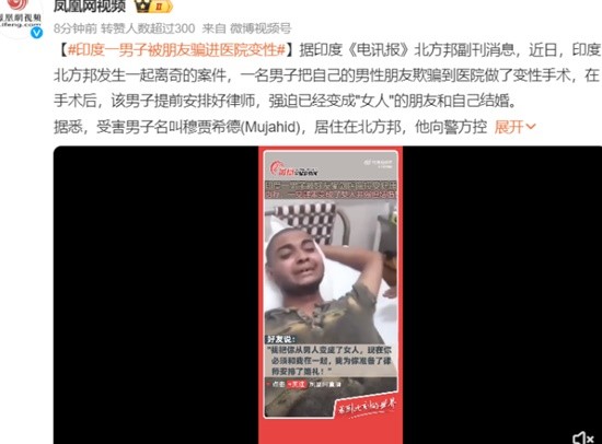 据凤凰网视频报道,印度《电讯报》北方邦副刊消息,近日,印度北方邦发生一起离奇的案件,一名男子把自己的男性朋友欺骗到医院做了变性手术,在手术后,该男子提前安排好律师,强迫已经变成"女人"的朋友和自己结婚。