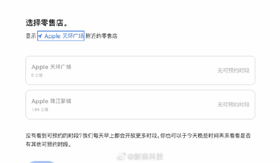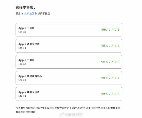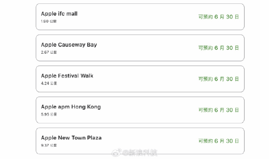 据新浪科技报道,目前全国所有Apple零售店的预约演示试用均需延后数日,已无首发日当天或临近的日期可供预约。例如北京的5家零售店可预约7月2日-4日,上海的8家零售店可预约7月1日-2日,零售店较少的广州、深圳等城市甚至已无时段可以预约。惟同日首发的中国香港特别行政区预约名额稍显宽松,可预约6月30日的演示试用。