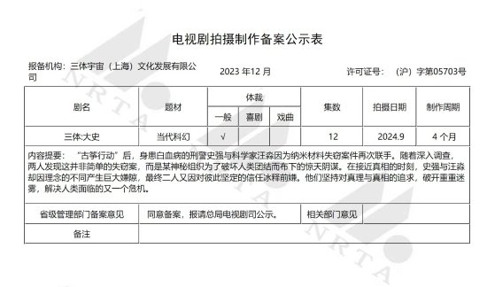 早在去年12月的电视剧备案公示中,就已经公布了电视剧《三体:大史》将于今年9月开拍的消息。不知为何官方选择了延期开拍。