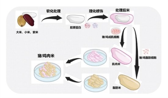 该团队巧妙利用鸡、猪肌肉和脂肪细胞的贴壁生长特性,将大米、小米及紫米预处理后,创造性地作为细胞生长的支架。这一创新不仅为细胞提供了一个理想的微环境,还在细胞增殖和分化的过程中,形成了一种营养全面且成分可精确控制的组合食品。