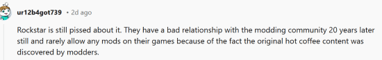 玩家表示该事件的影响巨大,R星仍然对此感到生气。20 年后,他们与MOD社区的关系仍然很糟糕,并且很少允许在他们的游戏中使用任何MOD,因为最初的热咖啡内容是由模组制作者发现的。