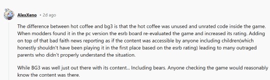 而也有玩家提到,这两款游戏的区别在于,热咖啡是《GTASA》游戏内未使用且未评级的代码,在游戏发售时完全没有告知玩家和评级机构。而《博德之门3》则是让每位玩家知道“刺激内容”的存在。