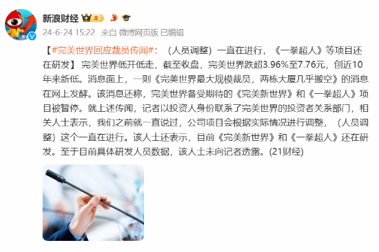 新浪财经援引21财经消息,完美世界低开低走,截至收盘,完美世界跌超3.96%至7.76元,创近10年来新低。消息面上,一则《完美世界最大规模裁员,两栋大厦几乎搬空》的消息在网上发酵。