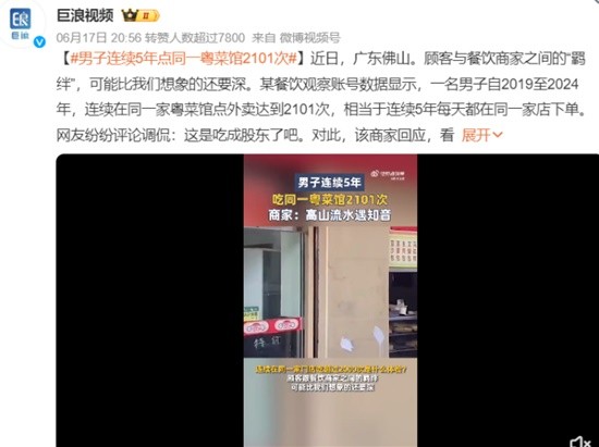 某餐饮观察账号数据显示,一名男子自2019至2024年,连续在同一家粤菜馆点外卖达到2101次,相当于连续5年每天都在同一家店下单。网友纷纷评论调侃:这是吃成股东了吧。