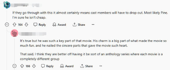 对于这样的说法,有网友表示了自己的担忧,认为预算减少的话电影的品质也会随之下降。还有一些粉丝担心前作的演员可能会因为片酬的原因而遭到更换。